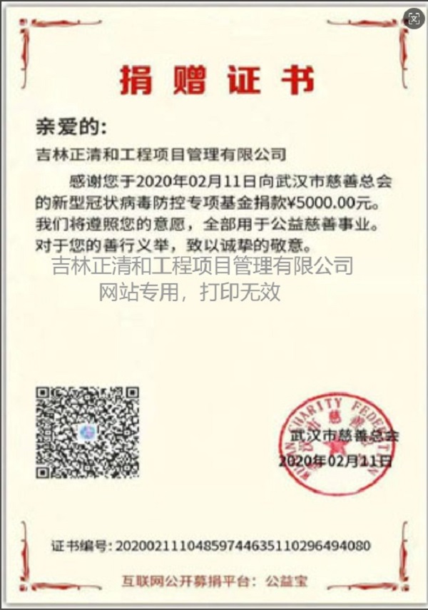 向吉林省慈善总会捐赠证书