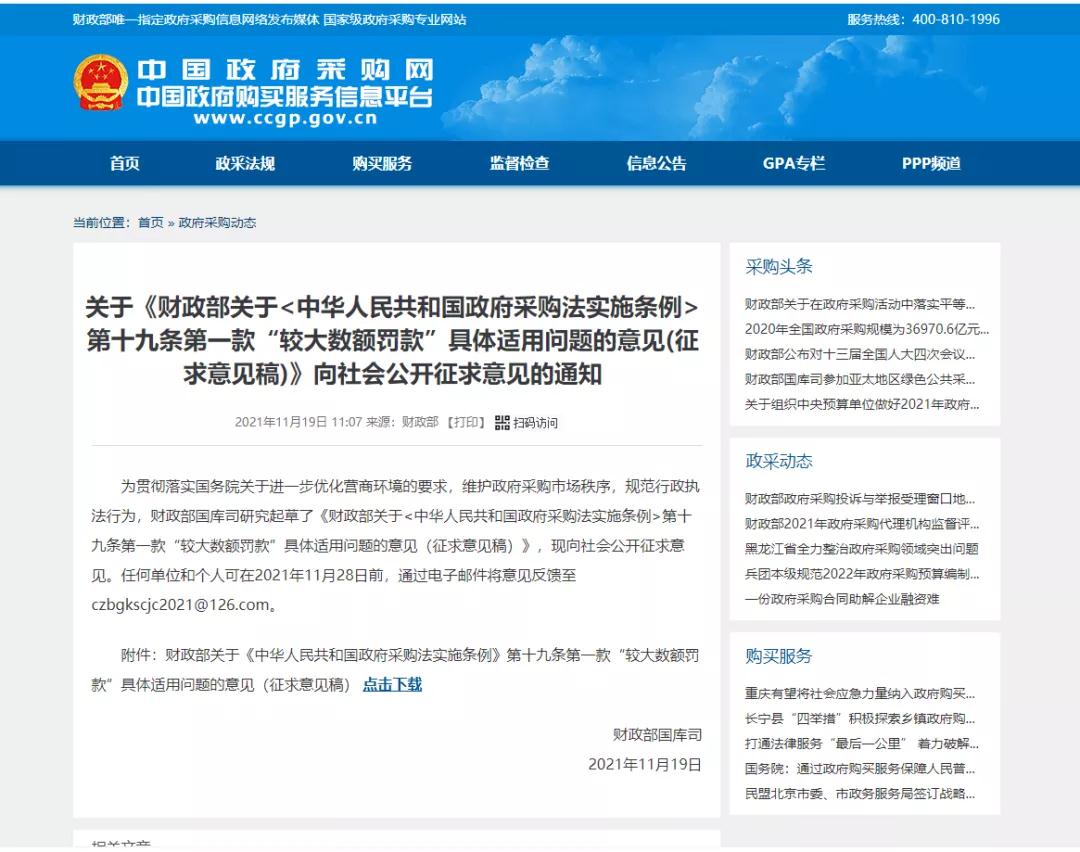 为贯彻落实国务院关于进一步优化营商环境的要求,维护政府采购市场秩序,规范行政执法行为,财政部国库司研究起草了《财政部关于<中华人民共和国政府采购法实施条例>第十九条第一款“较大数额罚款”具体适用问题的意见(征求意见稿)》,现向社会公开征求意见。任何单位和个人可在2021年11月28日前,通过电子邮件将意见反馈至czbgkscjc2021@126.com。